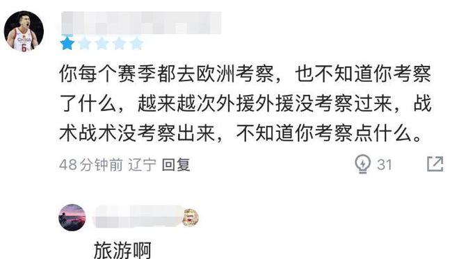 近期状态不佳的辽篮,在主场面对势头正盛的山东,虽然双方一度打得难解难分,但最终还是以5分惜败,这也让不少辽篮球迷对杨鸣感到极为愤怒:“每个赛季都去欧洲考察,也不知道你考察了什么,越来越次,外援没考察过来,战术没考察出来”、“你也因为身体原因辞职吧”。